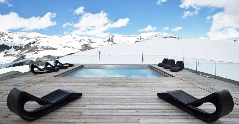 A rooftop swimming pool, steam room and sauna for a wellness in high altitude. You might even observe skiers while swimming.